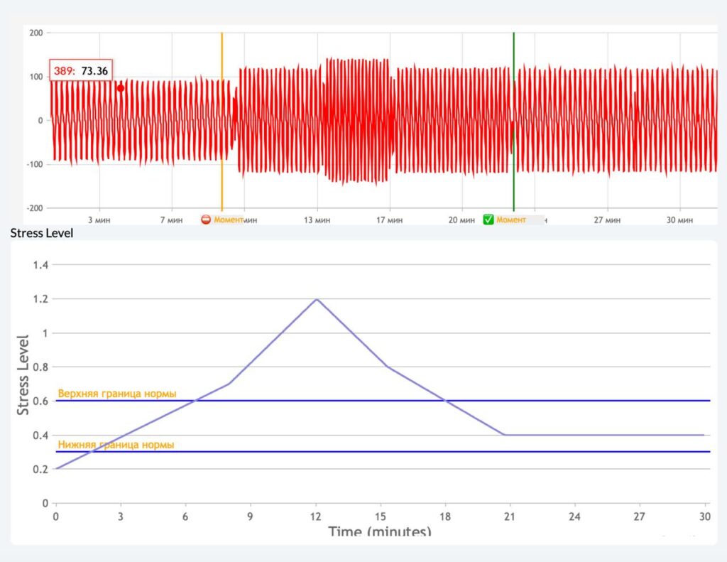 Кроме того, наше решение позволяет не только оценивать указанные параметры , но и с помощью научно подтверждённой технологии биологической обратной связи (БОС) тренировать стрессоустойчивость».